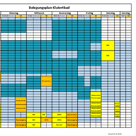 Schaut Euch unseren aktuellen Belegungsplan an, damit Ihr wisst, welche Bahnen und Becken Euch wann zur Verfügung stehen. ACHTUNG: Dienstags und…
